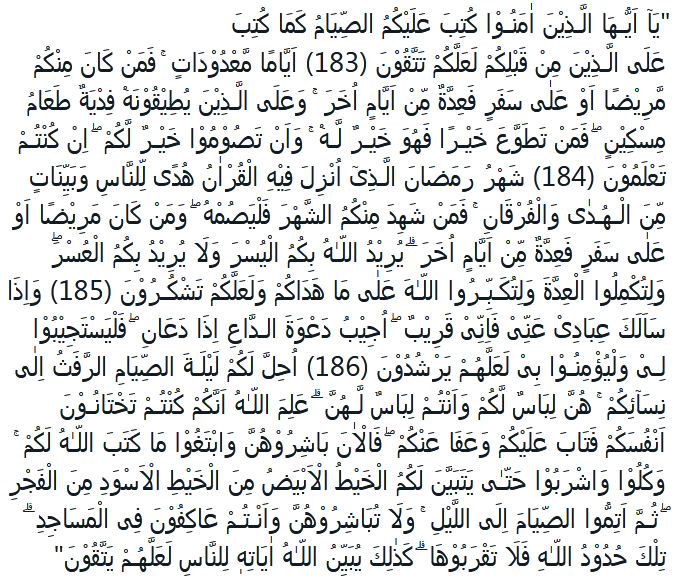 तरजुमाः- ईमान वालो तुम पर रोज़ा फर्ज़ किया गया, जैसा उन पर फर्ज़ किया गया था, जो तुमसे पहले हुए ताकि तुम गुनाहों से बचो चंद दिनों का फिर तुम मैं से जो कोई बीमार हो, या सफर में हो वह और दिनों में गिनती पूरी करे और जो ताक़त नहीं रखते वह फिदिया दें एक मिस्कीन का खाना फिर जो ज़्यादा भलाई करे तो यह उसके लिए बेहतर है और रोज़ा रखना तुम्हारे लिए बेहतर है, अगर तुम जानते हो माहे रमज़ान जिसमें क़ुरान उतारा गया, लोगों की हिदायत को और हिदायत ह़क़ और बातिल में जुदाई बयान करने के लिए, तो तुम में जो कोई यह महीना पाए उसका रोज़ा रखे और जो बीमारी या सफर में हो वह दूसरे दिन में गिनती पूरी करे, अल्लाह तुम्हारे साथ आसानी का इरादा करता है, सख़्ती का इरादा नहीं फरमाता और तुम्हें चाहिए की गिनती पूरी करो और अल्लाह की बढ़ाई बोलो, कि उसने तुम्हें हिदायत दी और इस उम्मीद पर कि उसके शुक्रगुज़ार हो जाओ और ऐ महबूब जब मेरे बंदे तुमसे मेरे बारे में सवाल करें तो मैं नज़दीक हूं, दुआ करने वाले की दुआ सुनता हूं जब यह मुझे पुकारें तो उन्हें चाहिए कि मेरी बात क़बूल करें और मुझ पर ईमान लाएं इस उम्मीद पर की राह पाएं, तुम्हारे लिए रोजे़ की रात में औरतों से हमबिस्तरी को ह़राम किया गया, वह तुम्हारे लिए लिवास हैं और तुम उनके लिए लिवास, अल्लाह को मालूम है कि तुम अपनी जानों पर ख़यानत करते हो तो तुम्हारी तौबा क़बूल की और तुम्हें माफ फरमाया तो अब उनसे हमबिस्तरी करो और उसे चाहो जो अल्लाह ने तुम्हारे लिए लिखा और खाओ और पियो उस वक़्त तक की फज्र का सफेद ढोरा काले ढोरे से मुमताज़ हो जाए फिर रात तक रोज़ा पूरा करो और उनसे हमबिस्तरी न करो उस ह़ाल में कि तुम मस्जिद में मोअ़तकिफ हो यह अल्लाह की हदें हैं इनके क़रीब ना जाओ अल्लाह अपनी निशानियां यूं ही बयान फरमाता है कि कहीं वह बचें |